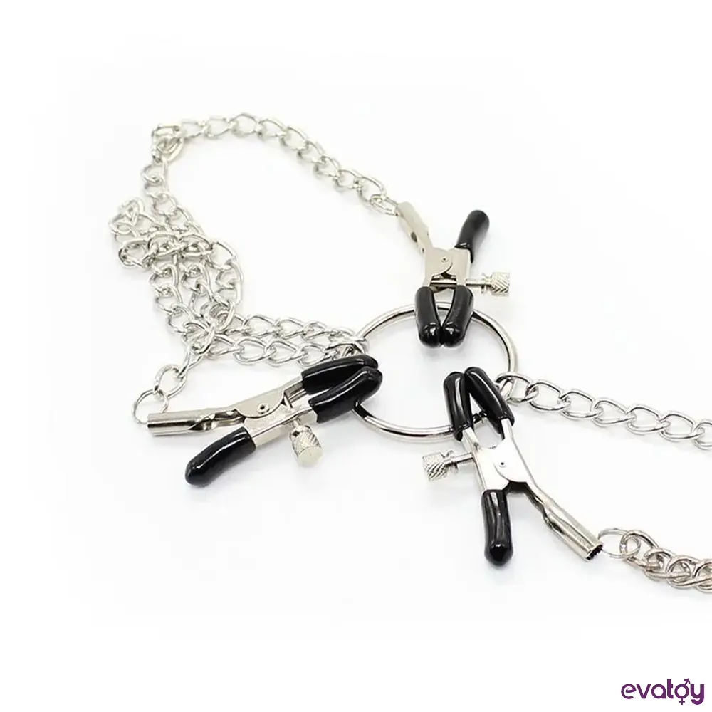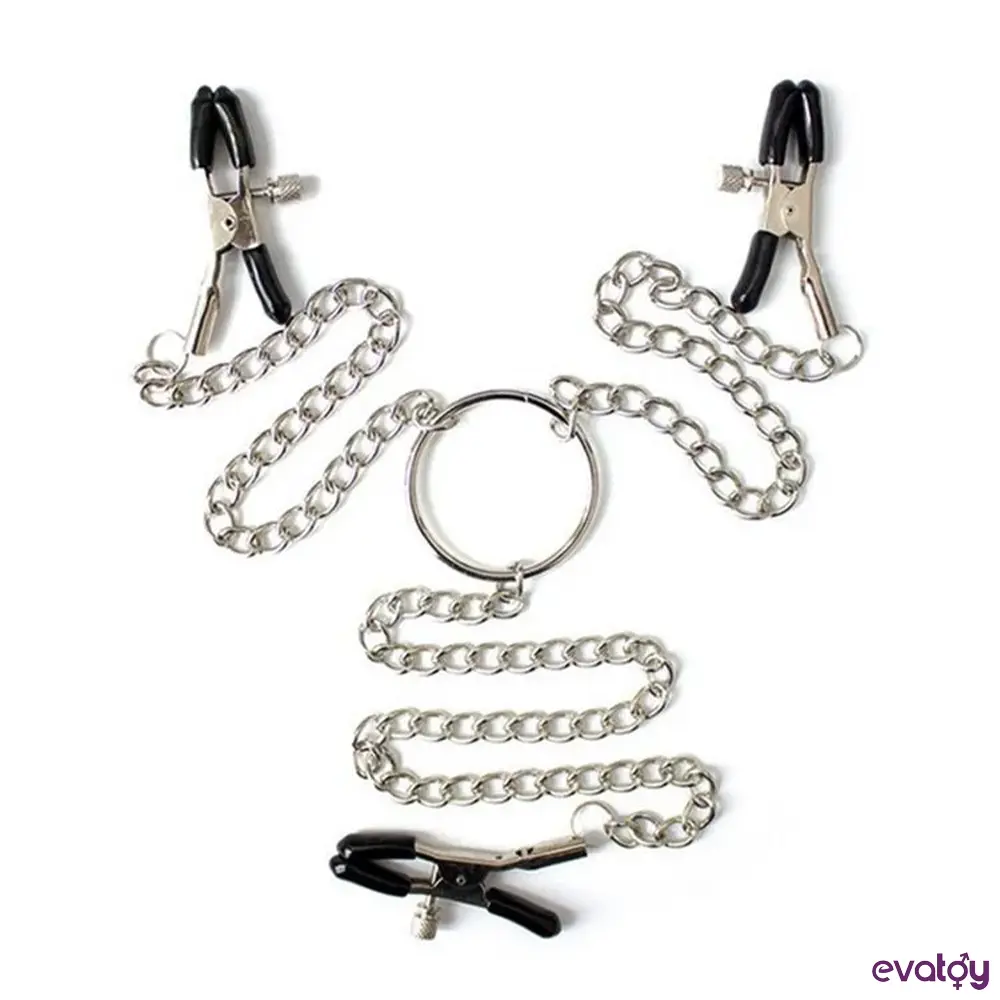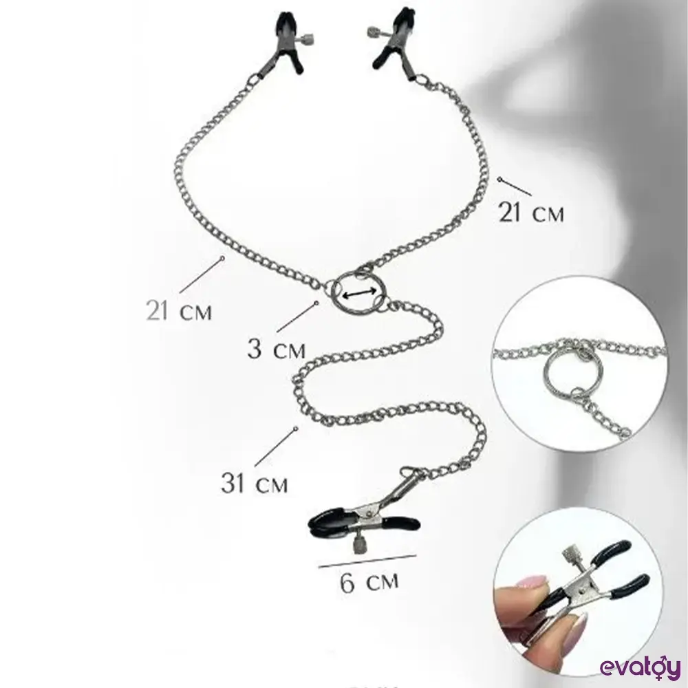 Üç zincirdeki, kadın göğüs ucu kelepçeleri, en hassas bölgeleri birbirine bağlamak için tasarlanmış samimi, uyarıcı bir aksesuardır! Meme uçlarındaki elbise klipsleri göğüsleri uyarır ve vidayı ayarlayarak sıkma derecesini kendiniz belirlemenize olanak tanır.