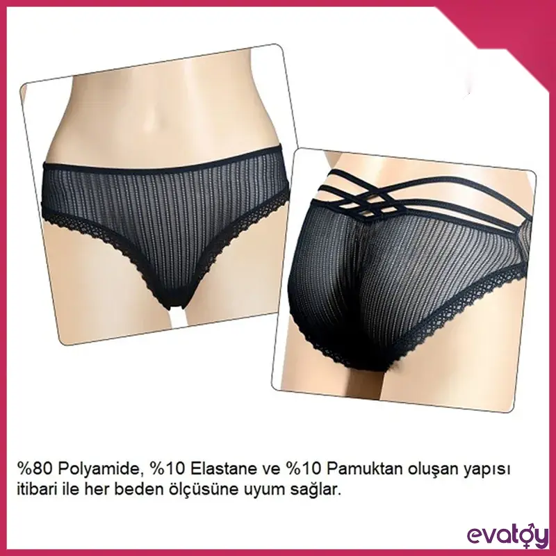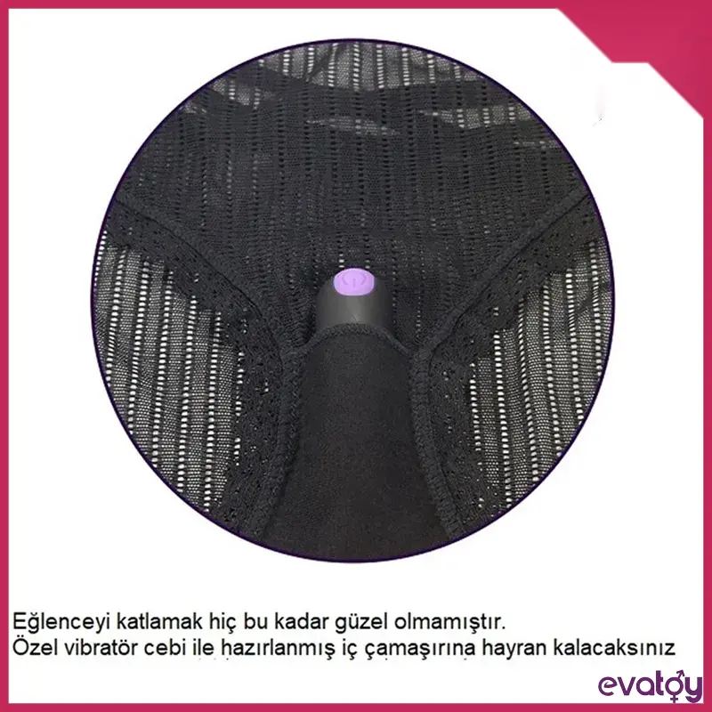 Dantel tanga kasık kısmındaki gizli bir cep, konforlu ve gizli uyarım için küçük bir eyere yerleştirilmiş, dahil edilen 10 x fonksiyonlu mini vibratörü tutar.